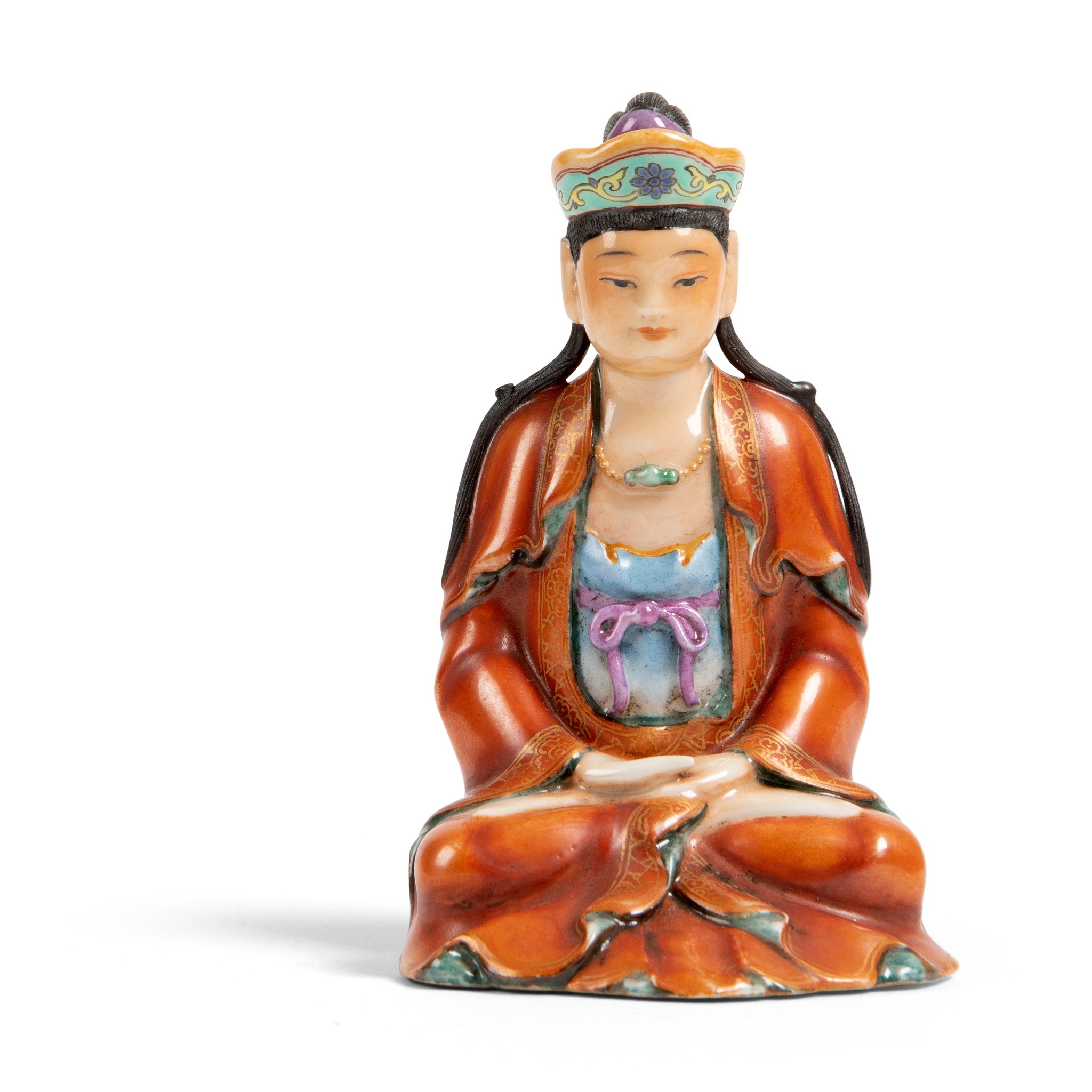 shown seated in padmāsana, hands in dhyana mudra, wearing a lotus crown and orange-red long robe