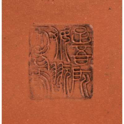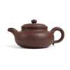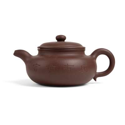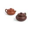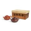 each elegantly potted with a squatted globular body, attached with a looped handle and short spout, one of orangey stoneware body with plain undecorated sides, the other with purplish body engraved with 'Zuo You Lan Yan (座有蘭言)' mark on one side, the reverser carved with inscription '全國省銀行第六次座談會紀念,江蘇省農民銀行、江蘇省銀行敬賀' indicating that this pot was commissioned by the Jiansu Provisional Bank as a gift, each cover stamped with maker's "Gu Jing Zhou' mark on the interior, the base stamped with his artist mark '足吾所好玩而老焉', with a Japanese tomobako wooden box