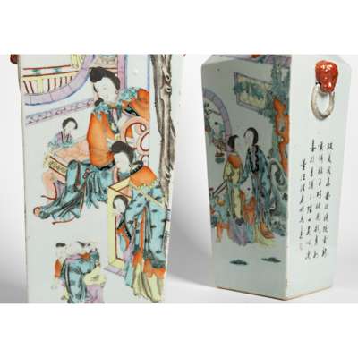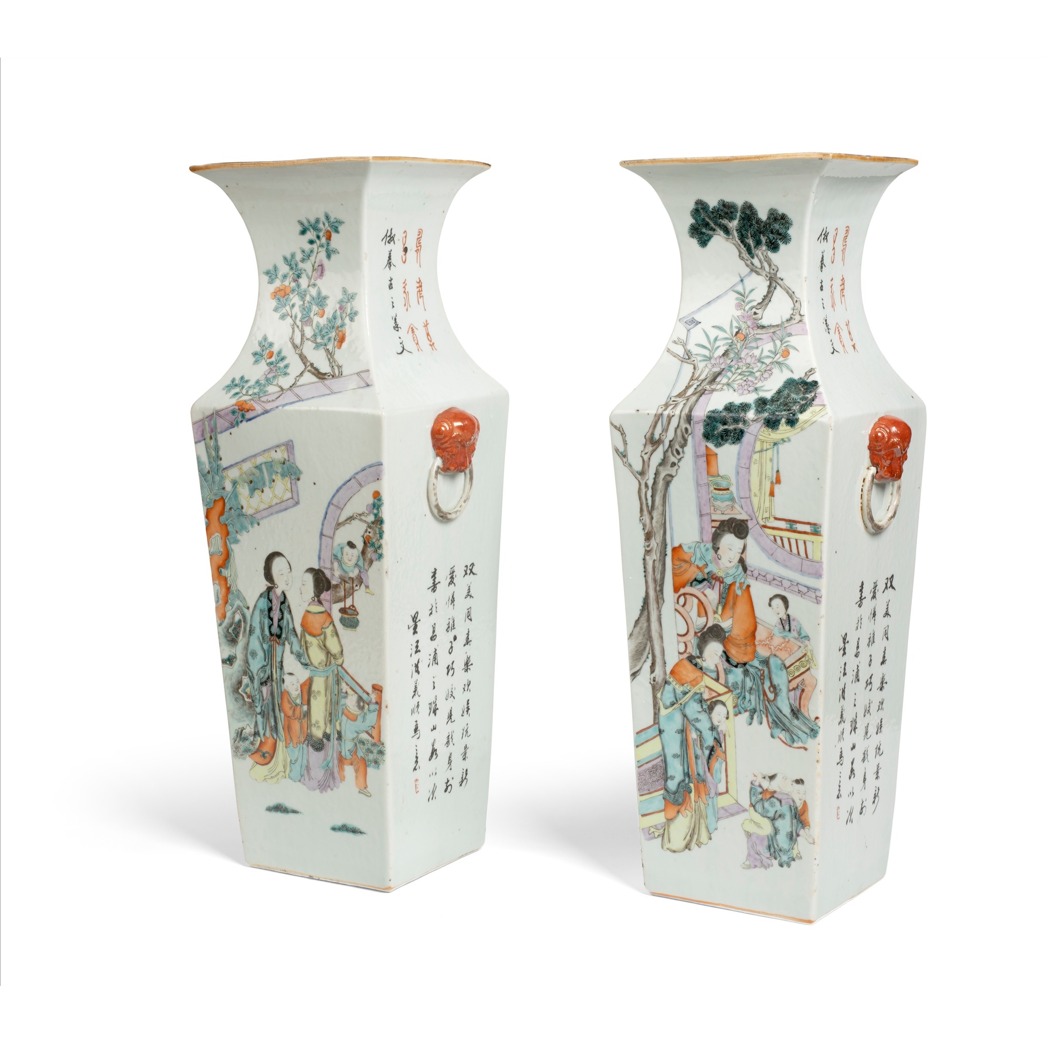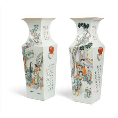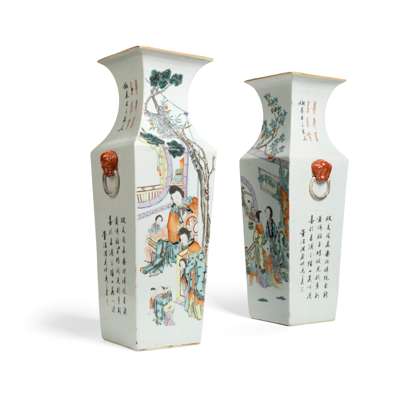 PAIR OF FAMILLE ROSE SQUARE-SECTIONED VASES