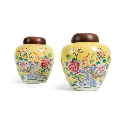 清 黃地粉彩鳳凰牡丹紋罐帶木蓋(一對)