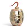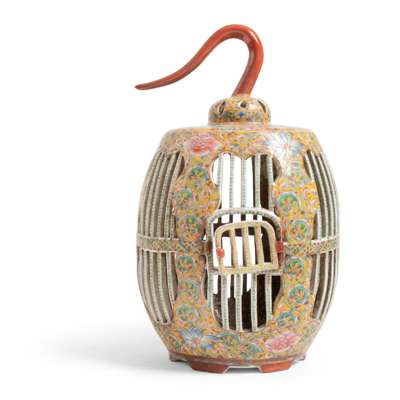 the barrel-form body supported on six bar-feet set with a prodigious sinuous hook on top, the body with pierced openwork cartouches set with vertical bars, all against a yellow ground richly decorated with floral scrolls, the flattened top further with two green dragons, central base perforated, one side of the central band inscribed from right to left with a six-character Qianlong mark