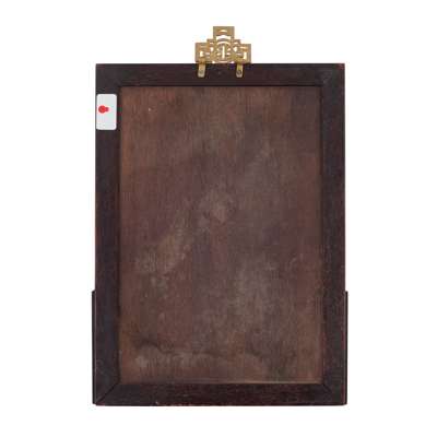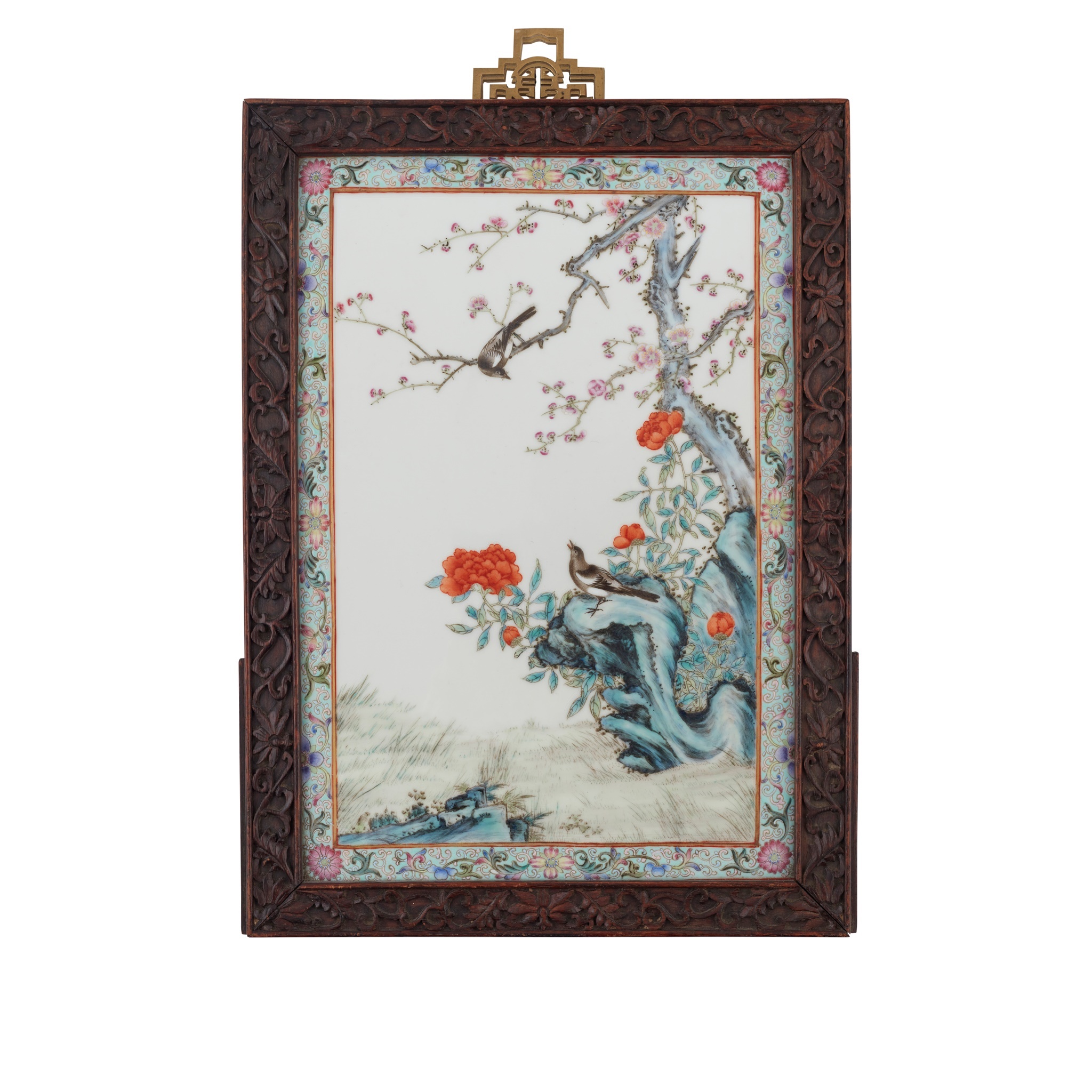of rectangular shape, finely depicting two magpies looking at one another from a prunus branch and a stylised rock, the rock further issued with peony blooms, all within a turquoise ground border decorated with scrolling floral and foliage, with wooden frame
