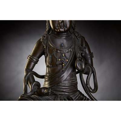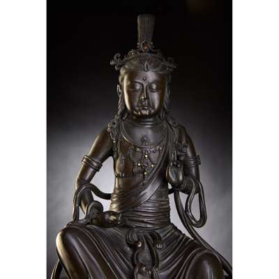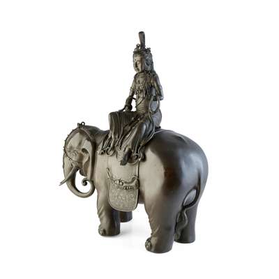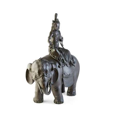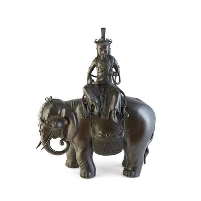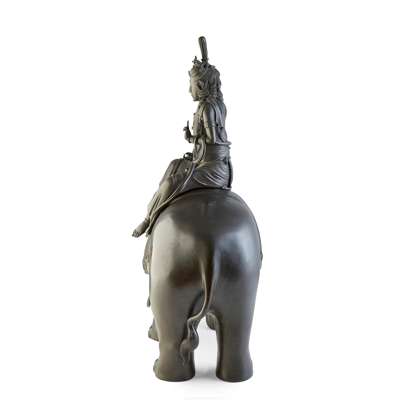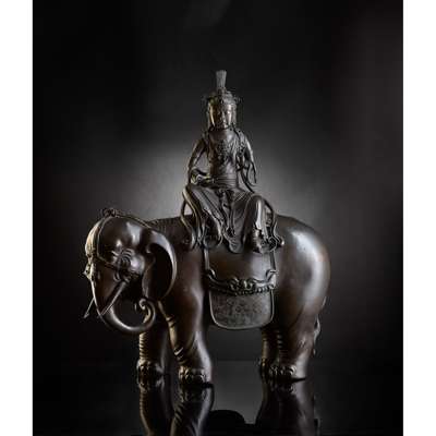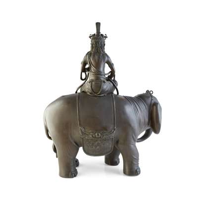 The magnificent example presented here is conventionally cast in generous proportions in two parts. His face with a downward benevolent gaze forming a meditative solemn expressions. The Bosatsu is distinguishable largely by his designated Elephant King vahana, which he sits on in latitasana. The two parts are combined with a short slot issuing from the end of the U-shaped ribbon on the figure’s back, sets on an aperture on the top of the elephant before a large and hollowed hemisphere. The harmonious formation of the group embodies all the requirements of the Buddhist iconography, emanating meditative tranquillity and the sense of transcendental wisdom.