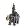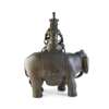 composed in two parts, the detachable bodhisattva seated in royal ease pose with his right leg gently raised higher, his left hand raised before the chest in prana mudra and right rested on his thigh in dhyana mudra, wears a loose dhoti tightened on waist with a band from the left shoulder, bellowing scarf wraps around the hands flowing the legs, adorned on the front chest with garland of inlaid jewels, the high chignon surrounded by a moderate inlaid crown above a serene facial expression, on the back of a caparisoned and bejewelled elephant standing on all fours, unsigned