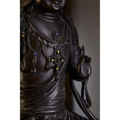 A comparable example of Fugen Bosatsu atop elephant can be seen in the Sanjūsangen-dō, a Buddhist temple of the Tendai sect in Kyoto, Japan (Publication: Buddhist Deities of Sanjusangen-do: Rengeo-in Sanjusangen-do Temple, 2000). This 13th century example was carved in the Heian-Kamakura Period, deemed to be the prototype of Fugen Bosatsu in Japanese Buddhism. The differences with our example are the presence of a lotus throne on the earlier piece, and the bosatsu is much relaxed in positions and incorporated better in flow with his vahara in the later piece.