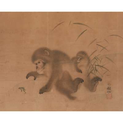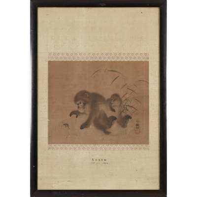 Note: Mori Sosen, active in the Osaka area, did many paintings of animals based on sketches from life and was especially known for his pictures of monkeys, deer being his next favourite theme. In about 1808, at the age of sixty-one, he even changed the first character of his name to one meaning 'monkey'. He also founded a school of animal painting with his brother Shuho, in Osaka, which paralleled the Maruyama school in Kyoto. Maruyama-Shijo School