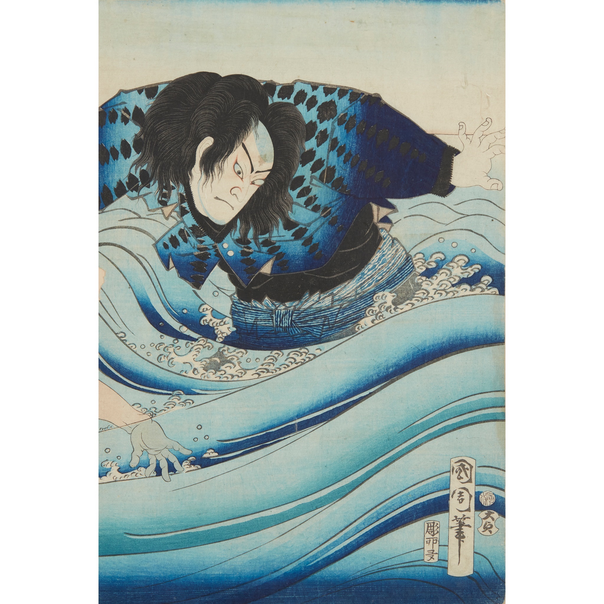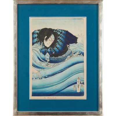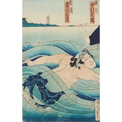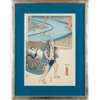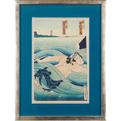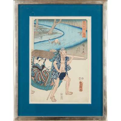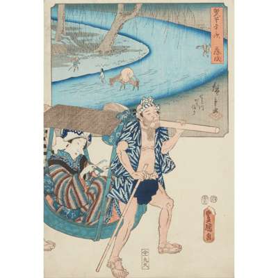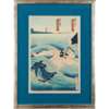comprising: 'Fujieda' from the series 'Fifty-three Stations by Two Brushes' by Utagawa Toyokuni III (1786-1865); and another two each depicting a male figure on water, both by Toyohara Kunichika (1835-1900), all framed