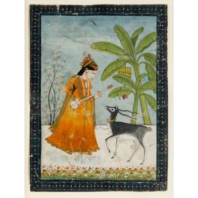 TODI RAGINI: A PRINCESS PLAYING A SITAR WITH A DEER IN A LANDSCAPE