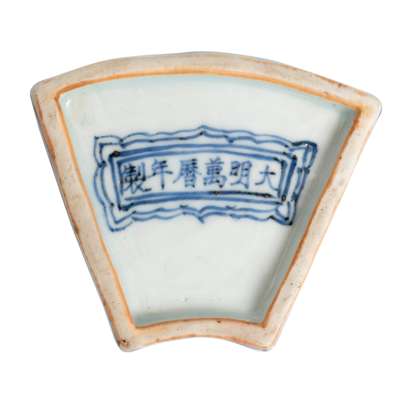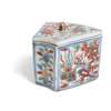 of fan-shape, three sides of the body painted with a pair of dragon and phoenix amongst flame-clouds, the cover similarly decorated, central topped with a finial, the base inscribed with a six-character Wanli mark within a shaped cartouche in underglaze blue