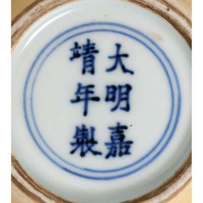 potted with high bulbous shoulders tapering down, the body carved with scholars in an outdoor setting underneath pine tree, applied overall with an opaque yellow glaze, the white-glazed base inscribed with a Jiajing mark in double-circles in underglaze blue