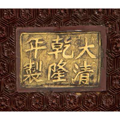 each side of the body delicately carved with figures in a landscape, the base inset with an apocryphal six-character Qianlong mark in a rectangular gilt-bronze panel