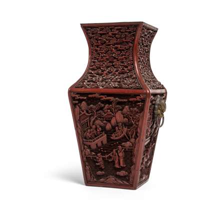 清 剔紅山水人物紋鎏金獅耳方瓶