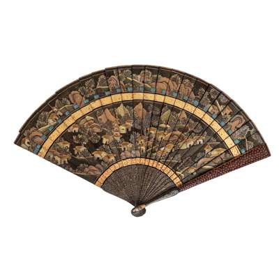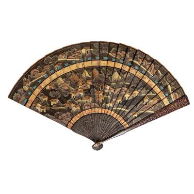 GILT LACQUERED 'LANDSCAPE' WOODEN BRISÉ FAN