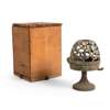 the disc censer supported on a stepped stem foot issuing from a swirling ornament, the hemispherical cover cast in openwork as a mountain range surmounted by a phoenix with broken hinges, with a Japanese tomobako wooden box