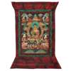 seated in dhyanasana on a lotus throne, hands in dhyanamudra supporting a bowl, with a body golden in colour, the Buddha dressed in red and gold patchwork robes, his serene face flanked by two pendulous earlobes, hair crowned with a jewel, all before an oval prabhamandala and turquoise nimbus, further backed by a tiered pagoda and trees, before him a row of disciples on knees offering to a monk, inscribed to the verso