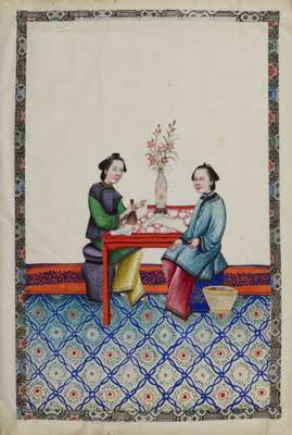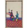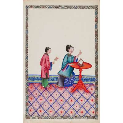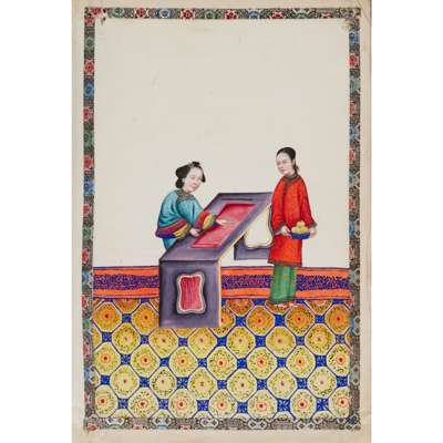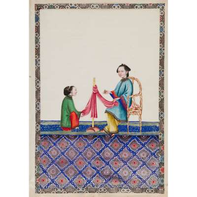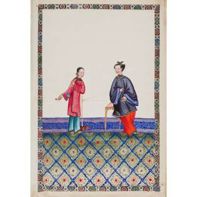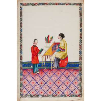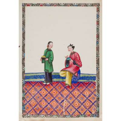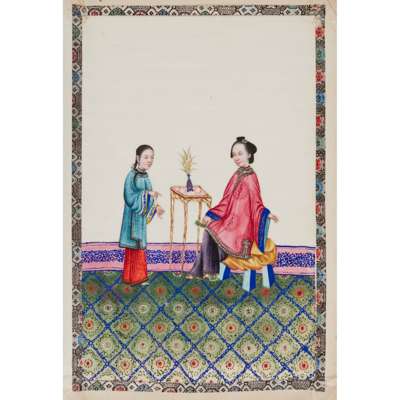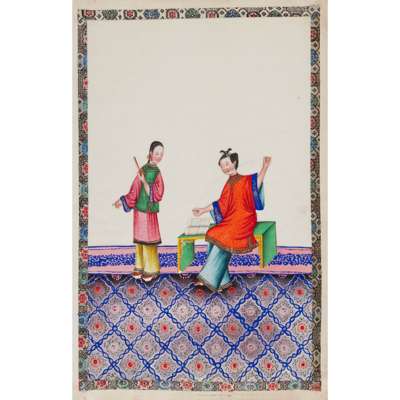 gouache on pith papers, each depicting in vivid colours an idle lady in various leisurely activities accompanied by a female attendant, all paintings enclosed with cloth borders, bound in an aubergine-coloured silk-covered album