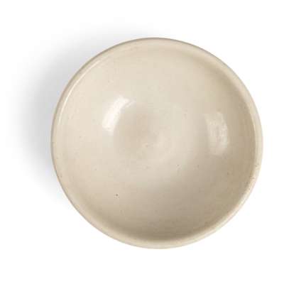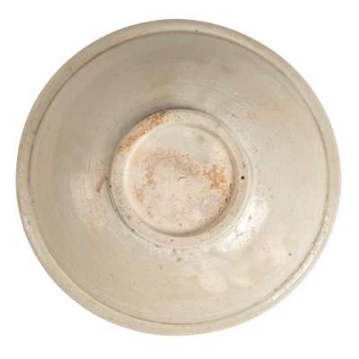 supported on a short foot and tapering toward a lipped rim, covered overall with a white glaze with greyish-green hue, leaving only the foot ring and the base unglazed