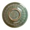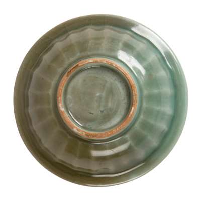potted with deep fluted sides carved with upright lotus petals on the exterior, rising to a flat everted rim, the interior decorated with a pair of moulded fish in relief, the dish covered overall with a celadon glaze with uneven yellowish tone, the foot ring unglazed, revealing the burnt orange body
