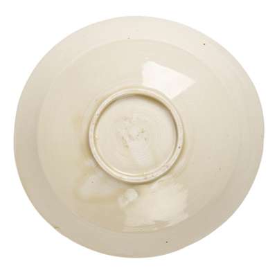 of steep conical form with notched rim, the interior carved with a day lily flower, covered overall with a creamy white glaze with ivory tinge