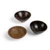 comprising: each of conical form, one decorated with three flower medallions on the interior on brown glaze, 12.5cm diameter; one covered in dark brown glaze suffused with light blue streaks, the base with a wax mark, 11cm diameter; and one shallow bowl covered in a light brown glaze with fine craquelure on the interior, 11.6cm diameter