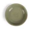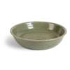 the shallow rounded sides rising from a short tapered foot to a flared rim, finely carved to the centre with two sinuous chi dragons amidst stylized ruyi-head cloud, the well with a border of lotus blooms between a narrow band of classic floral scroll, covered overall with an olive-green glaze, an unglazed ring to the base burnt orange in the firing