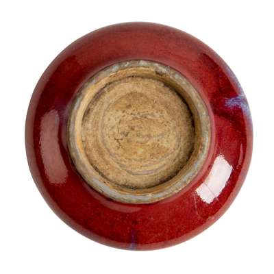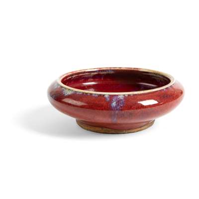 sturdily potted with rounded sides supported on a short tapered foot, decorated overall in an attractive mottled glaze ranging from strawberry red to pale lavender tones, leaving the base unglazed, with a Japanese tomobako wooden box