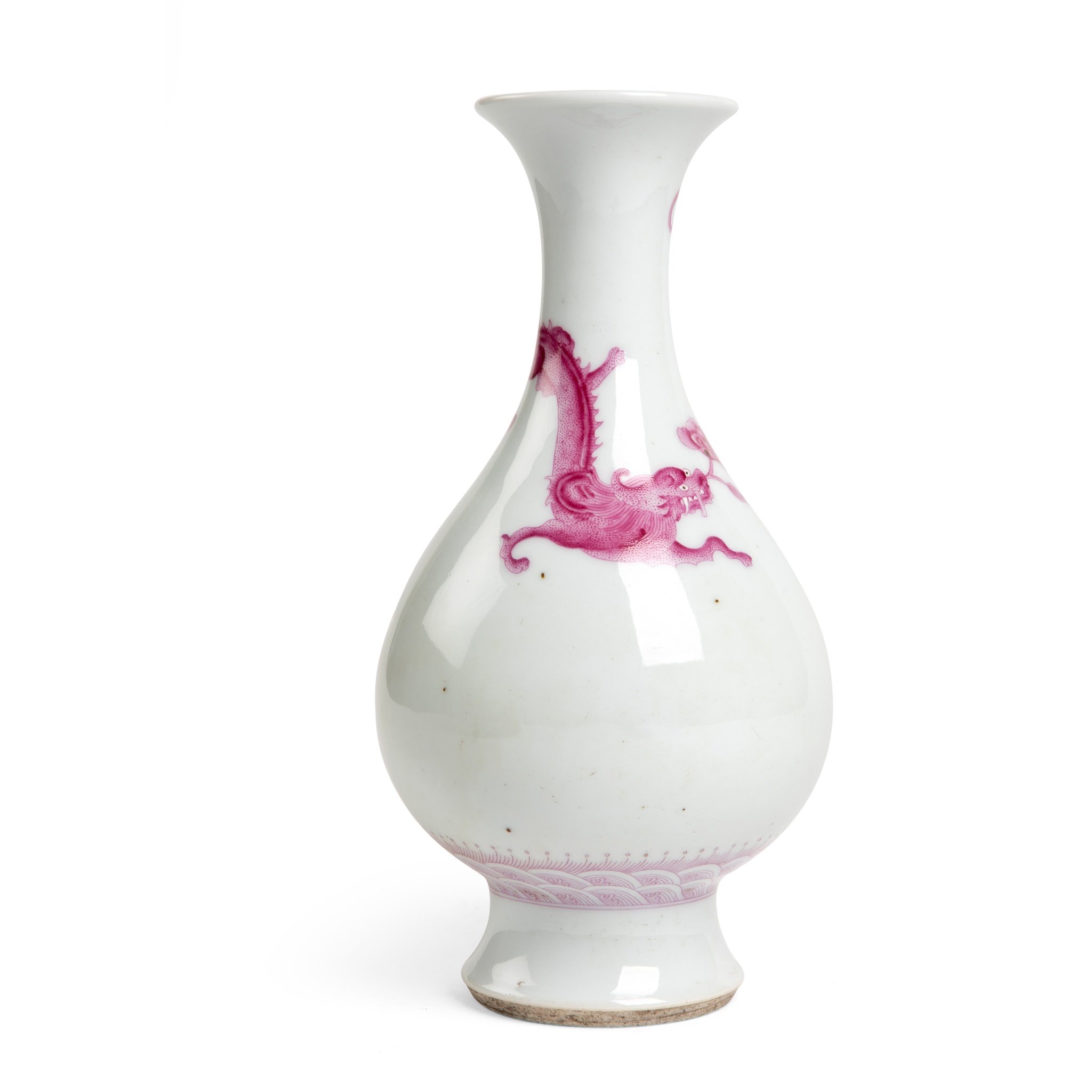 supported on a tall splayed foot, the globular body extended to a long neck and terminating to an everted rim, the exterior delicately painted with a purplish-red kui-dragon holding a lingzhi fungus in its mouth and meandering around the shoulder, all above a band of swirling waves above the foot