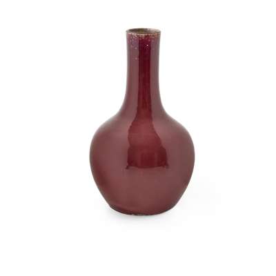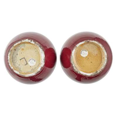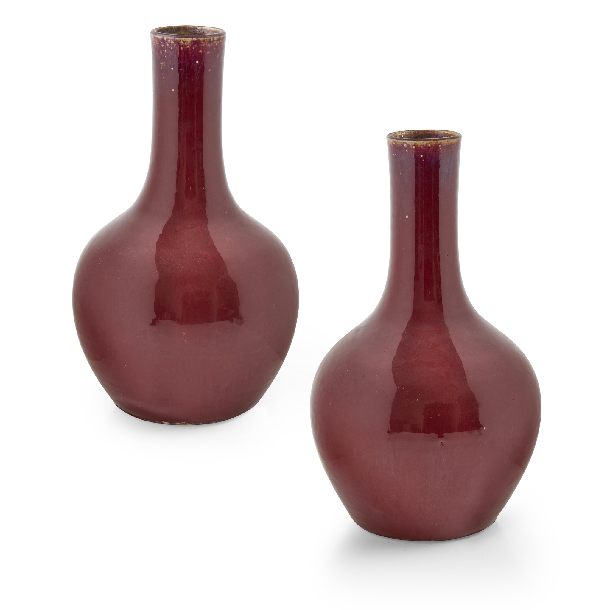 each sturdily potted from a recessed foot rising to a bulbous body and straight long neck, applied overall and save for the base with a thick red glaze, thinning from the mouth rim revealing the creamy body above lavender-coloured streaks