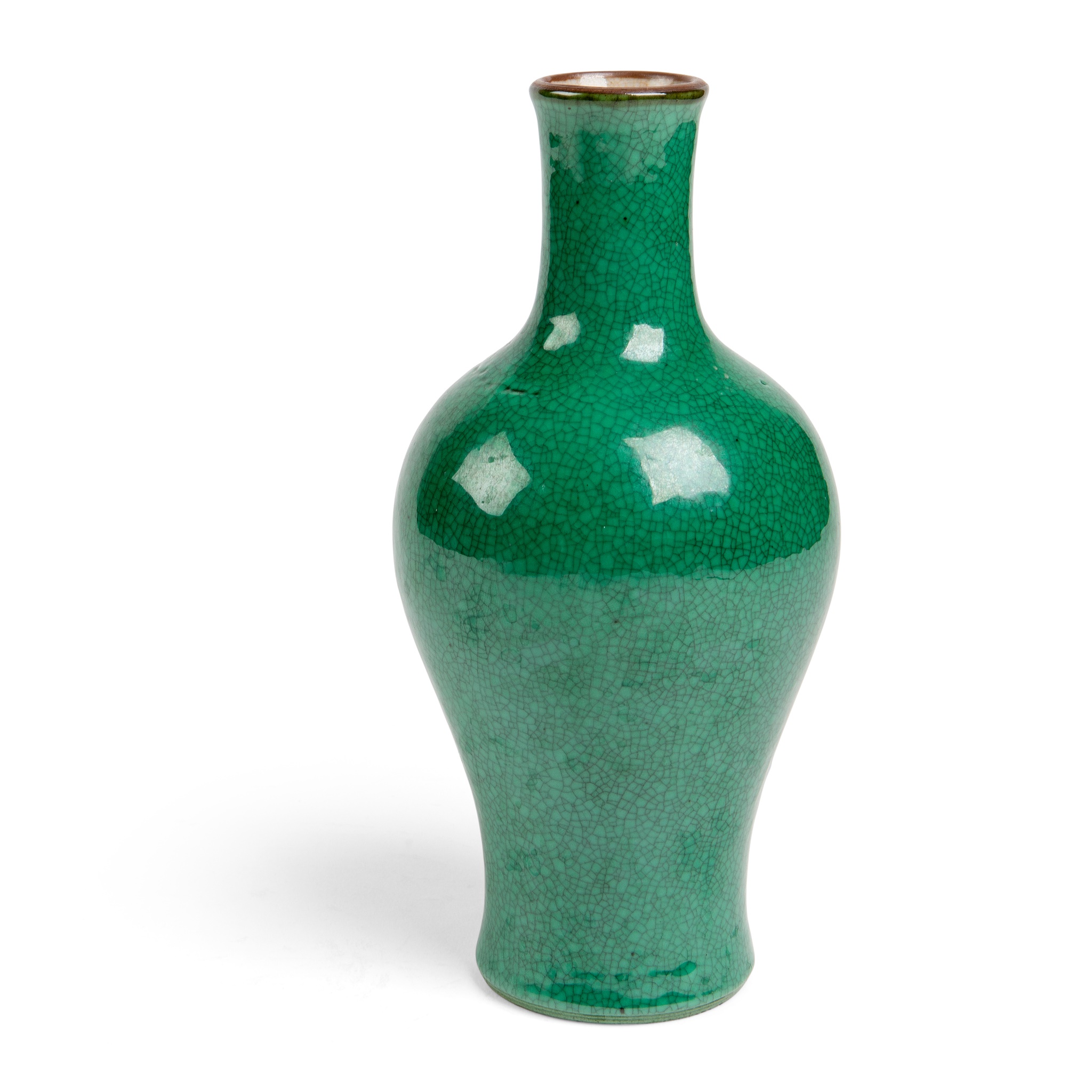 the spindle-shaped body rising from a splaying foot, surmounted by an elongated neck and terminating to an everted rim, the exterior covered in a pale apple-green crackled glaze