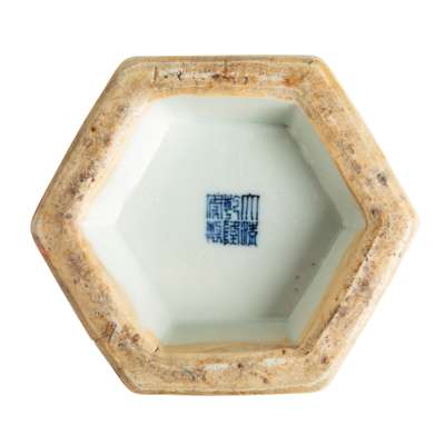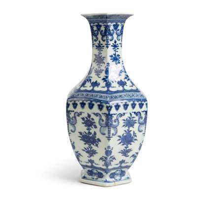 the bulbous body tapering to a high spreading foot and rising to a tall flared neck to form six facetted sides, the hexagonal facets are decorated with large single upright boughs of pomegranate, peach and persimmon alternating with flowering branches of peony, chrysanthemum and lotus, separated by elaborate scrolling motifs at the vertical raised edges, the neck and body divided at the shoulder by a band of dense wan and ruyi-heads, the base inscribed with a six-character Qianlong mark in underglaze blue