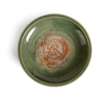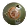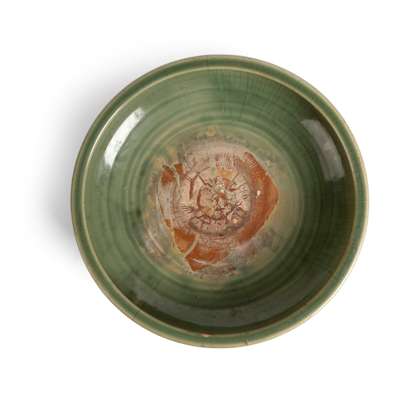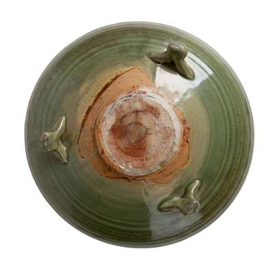 sturdily potted with a compressed bulbous body, supported on three lion-head feet to an inverted rim, the exterior of the body carved with horizontal bands and freestyle circles in between, parallel wavy lines to the neck, covered overall in olive green celadon glaze
