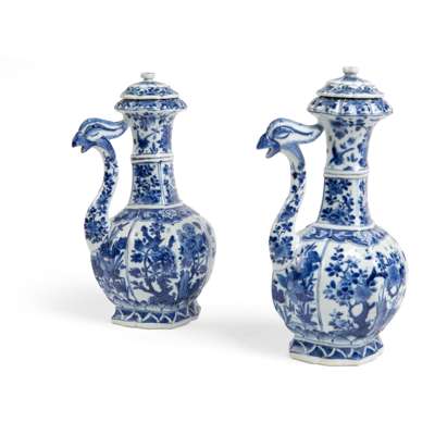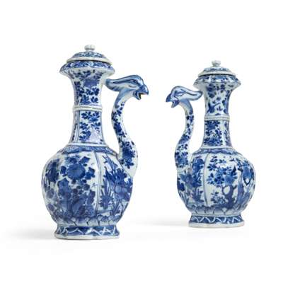 Note: Ewers of this form were originally inspired by Middle Eastern metal wares and were made for the export market. They were meant to exist in pairs. It is very rare to have their original lids still kept with the ewers. Compare a closely related ewer from the Avery Brundage collection now at the Asian Art Museum, San Francisco, acc. no. B60P249. A pair from the Grandidier collection, now at the Louvre museum, was paired with three blue and white bottle vases to form an ad hoc garniture set and is illustrated in La Ceramique Chinoise: De l’epoque de K’ang-Hi a nos jours, Paris, 1922, pl. 244. Two further comparable pairs were respectively sold at Christie's New York on 28 January 2013, lot 404 and Sotheby's New York on 20 March 2018, lot 452.