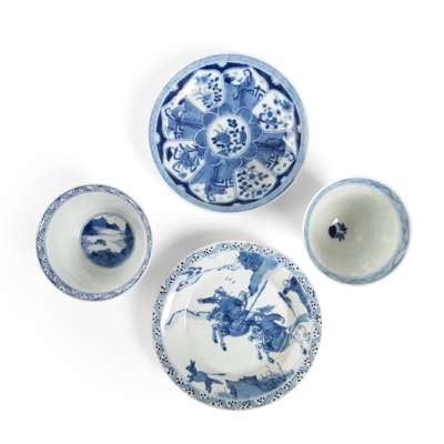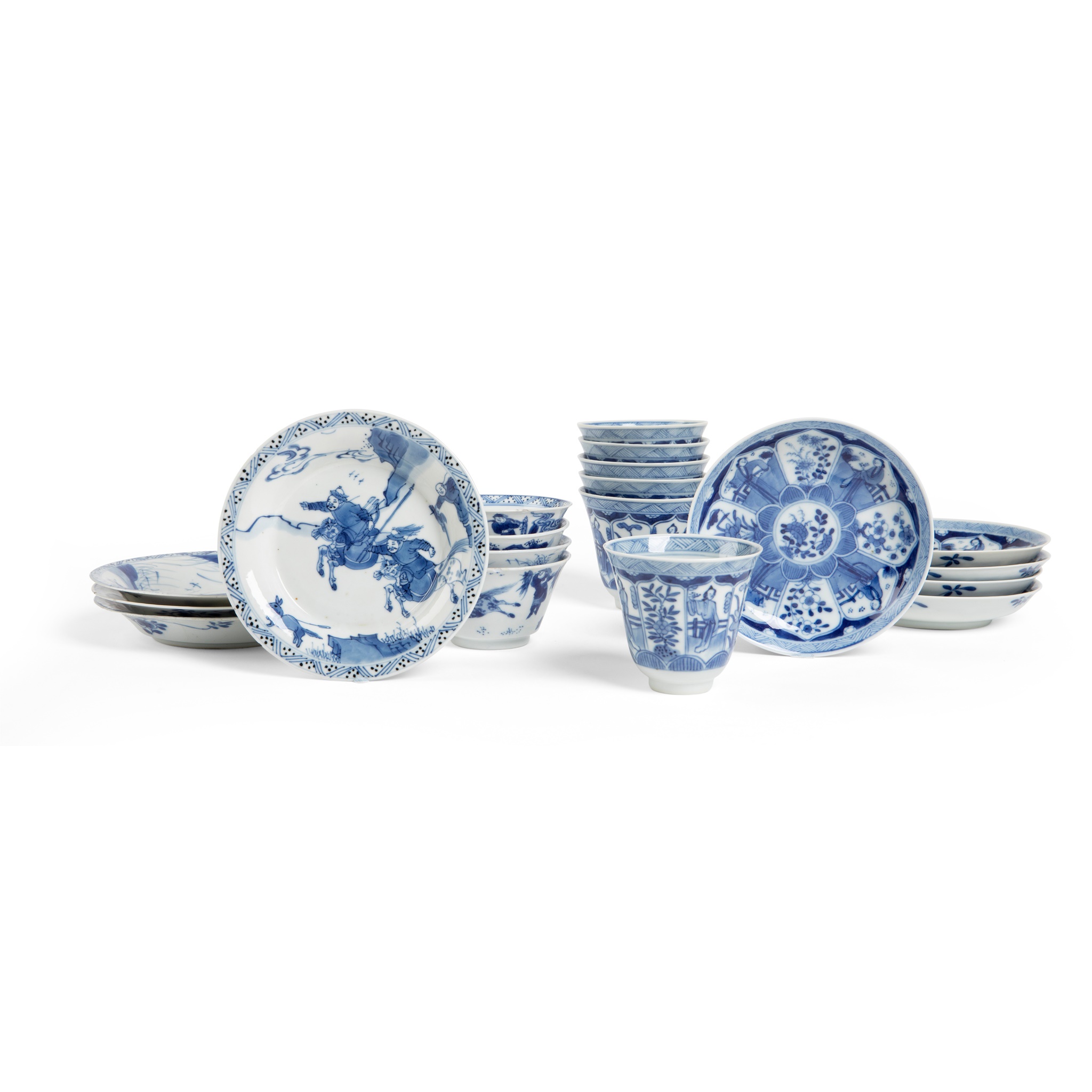 清康熙 玉款 青花人物紋仰鐘杯碟組(五套十一件)、狩獵紋馬蹄杯碟組(四套八件)(共十九件)
