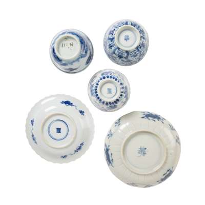 comprising: four matching sets of foliated teacups and saucers, each decorated with birds, flowers and rockwork, the base with a foliated floral motif mark; four matching sets of foliated teacups and saucers, with one extra saucer, each painted with flowers and birds, the base inscribed with a character-mark in square panel within double-circle; and five teacups each depicting cranes and pagoda, the base engraved with a Johanneum mark 'N=5II'