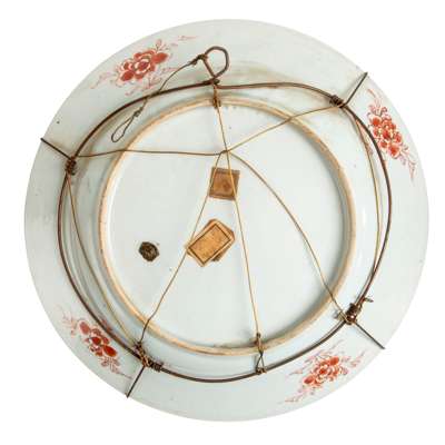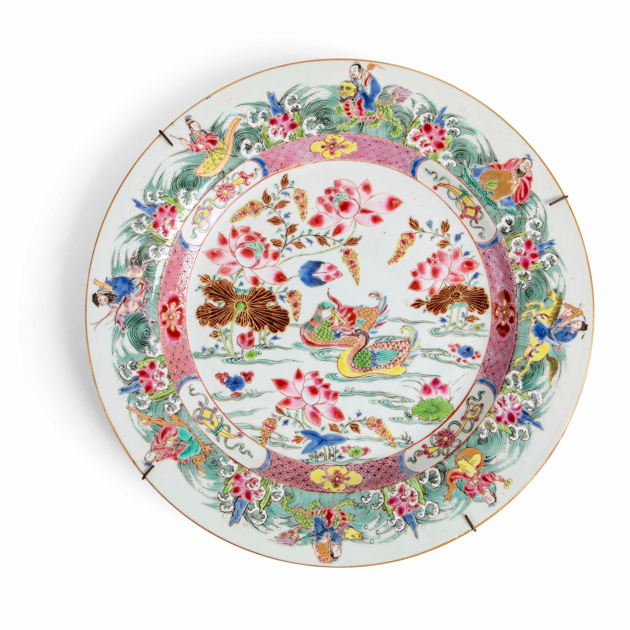 the central medallion delicately painted with a pair of Mandarin ducks swimming amongst lotus, enclosed with a band of eight Daoist immortals on the cavetto, each on their unique vahana sailing on ferocious swirling waves, the underside of the cavetto further decorated with four peony sprays in iron-red