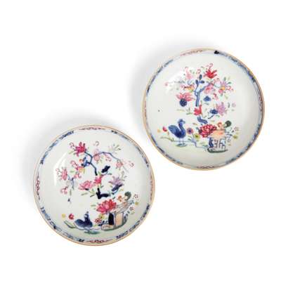 PAIR OF BLUE AND WHITE WITH FAMILLE ROSE 'ROOSTER' SAUCERS