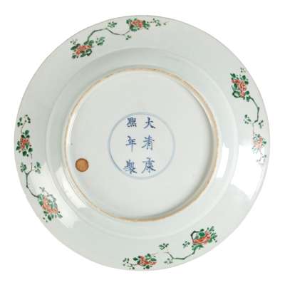 清康熙 青花「大清康熙年製」雙圈款 綠彩鳳凰麒麟紋盤