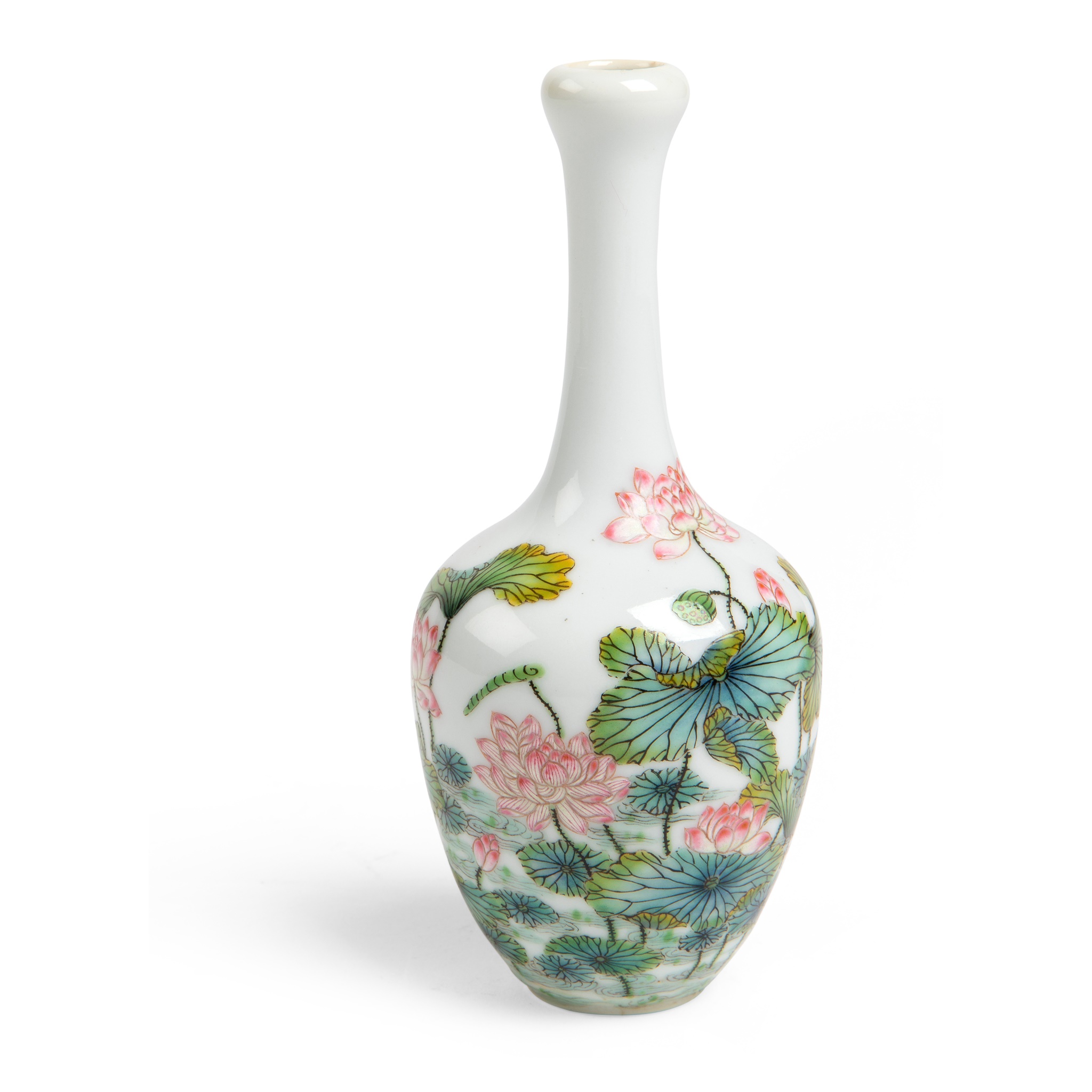the delicately potted vase supported on a short foot, the elongated neck tipped with a garlic-shaped mouth, the ovoid body adorned with pink lotuses blossoming from a leafy pond, the base inscribed with a four-character Yongzheng mark in underglaze blue