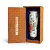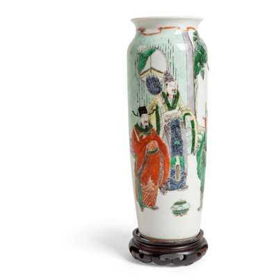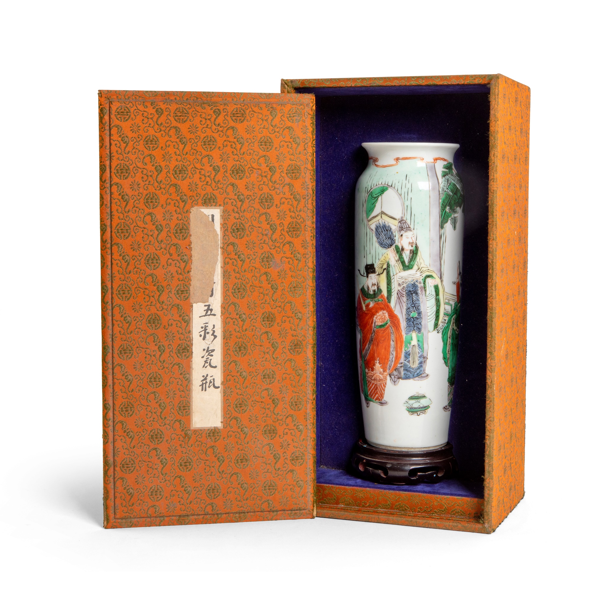 the tapered cylindrical body extended to a waisted neck and everted mouth rim, the body finely painted with the famous historical story Three visits to the cottage, depicting Zhuge Liang, a Chinese statesman and military strategist who lived during the Three Kingdoms period, holding his signature kongming fan and receiving a visit from the young warlord Liu Bei, the base inscribed a double-circle in underglaze blue; with a wooded stand and fitted cotton box