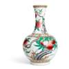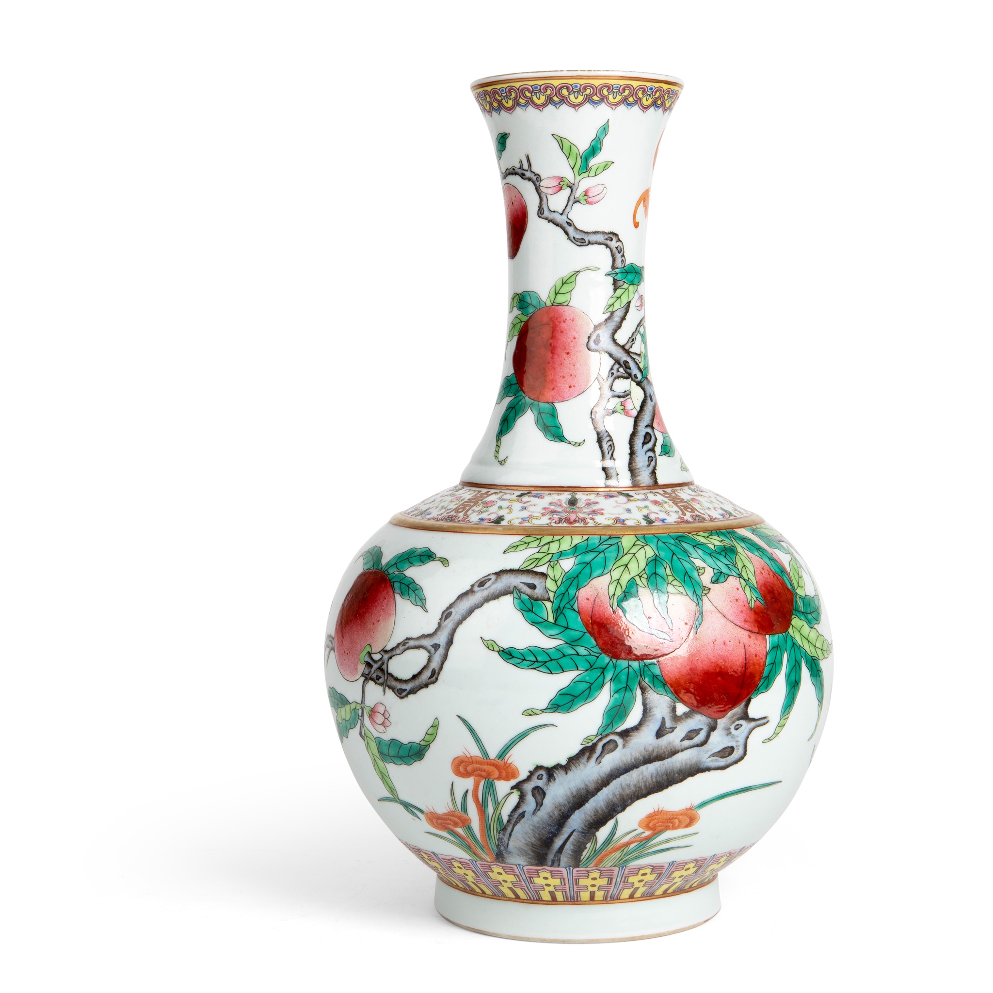 the globular body and slender neck decorated with spreading branches of a peach tree bearing nine ripe fruit and issuing numerous pink and white blossoms and leaves in different shades of green, two bats painted in iron-red flitting by, a band of lotus flowers and shou longevity character adorned the shoulder, the mouth rim and the ribbed shoulder covered in gilt paint, the base inscribed with a three-character 'Yu De Tang' mark in iron-red