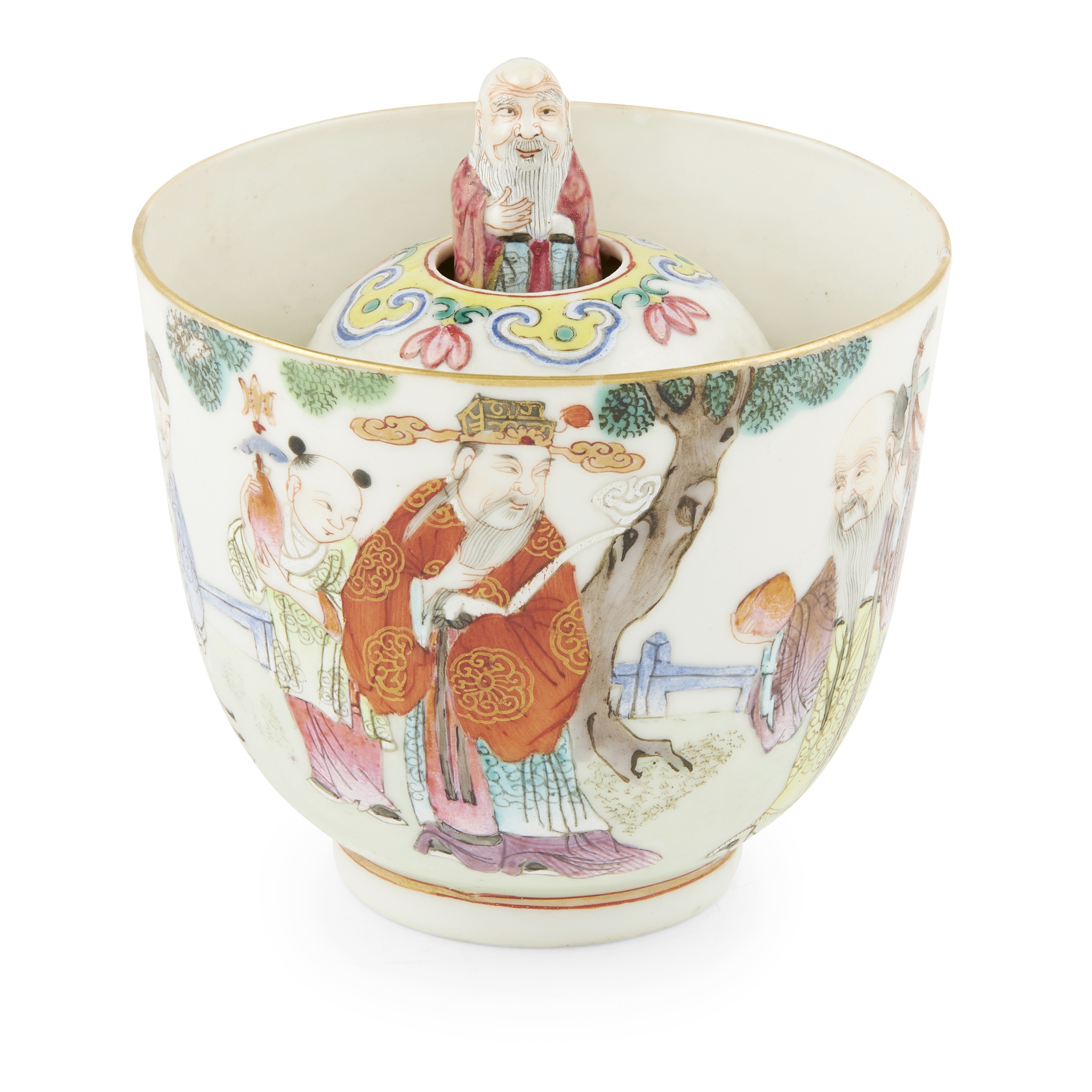 supported on a short foot, raised to rounded sides, the interior set with a dome, a ruyi-cloud and floral band surrounding the top-perforation, in which contained a moulded figure of Shoulao- God of longevity, exterior of the cup further painted with the Three Immortals- Fu (luck), Lu (wealth) and Shou (longevity) accompanied by a boy-attendant, the base inscribed with a six-character Jiaqing mark in gilt against iron-red square ground
