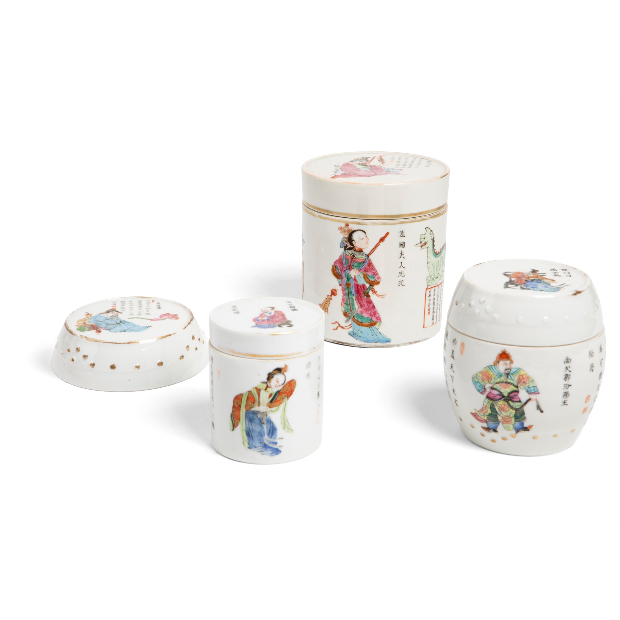 comprising: two cylindrical boxes with covers, 7.5cm and 11cm high; one drum-shaped box with cover, 9cm high; and one single drum-shaped cover, 10cm diameter; all finely painted with various Chinese historical figures in Wushuangpu