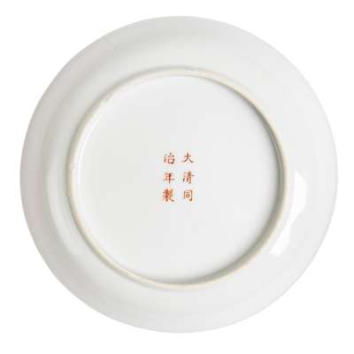 each supported on a short foot, the interior respectively painted with a dragonfly above flowers and a cicada hovering above reeds beside hyacinth flowers, each base inscribed with a six-character Tongzhi mark in iron-red
