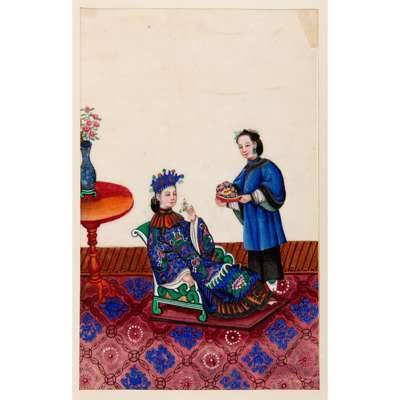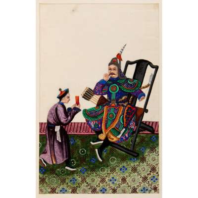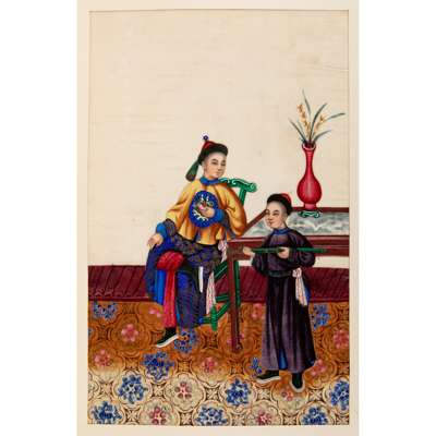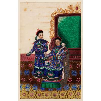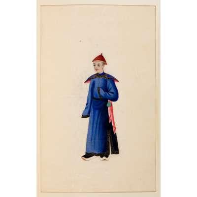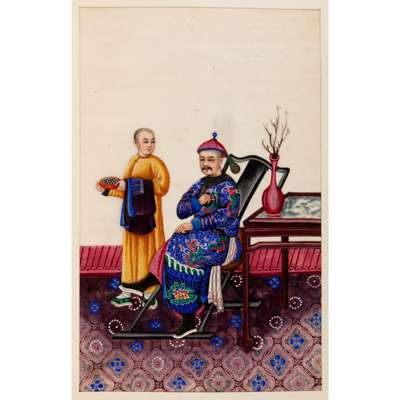 comprising: twelve paintings of female and male dignitaries clad in ornate court costumes and five paintings of street vendors