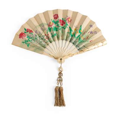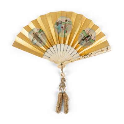 double-paper leaf with ivory sticks and guards, each side painted in ink, one side delicately painted with Japanese men and women walking along river banks with cherry blossom trees in three circular cartouches against a gilt-paint ground, the reverse depicted various flowers and butterflies in the field, the ivory guards decorated in gold paint with a flowering branch and birds