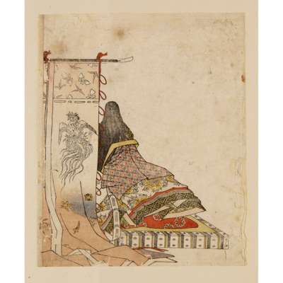 comprising one oban yoko-e print and three chuban tate-e prints; including one painted with Two Dancers in Butterfly Costumes; three with a lady in court robes