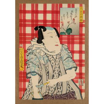comprising ten oban tate-e prints; including one entitled The Flowers of Edo (A Collection of Actors' Portraits): No. 33, Six Selected Flowers, Hardy Begonia; one Poem by Sanjôin Onna Kurodo Sakon: (Actor Ichikawa Danjuro VIII as) Tokijiro, from the series Comparisons for Thirty-six Selected Poems (Mitate sanjûrokkasen no uchi) etc.