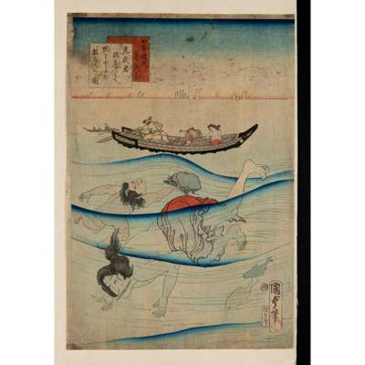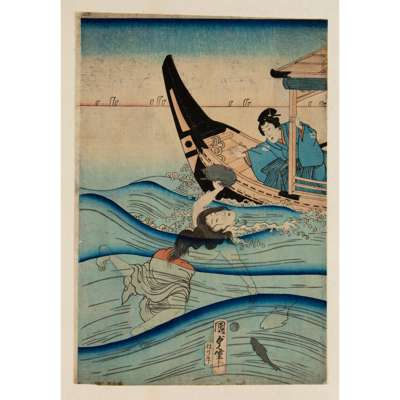 a oban tate-e triptych print showing Prince Genji in a boat with attendant page and a lady watching female awabi (abalone) divers called ama; Prince Genji was the protagonist of Murasaki Shikibu’s Heian-era novel The Tale of Genji, he was the second son of the emperor, and relegated to civilian life; published by Maruya Kyushiro, with a date mark 1865-V, signed Kunisada hitsu