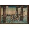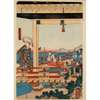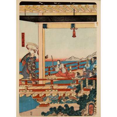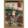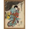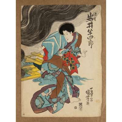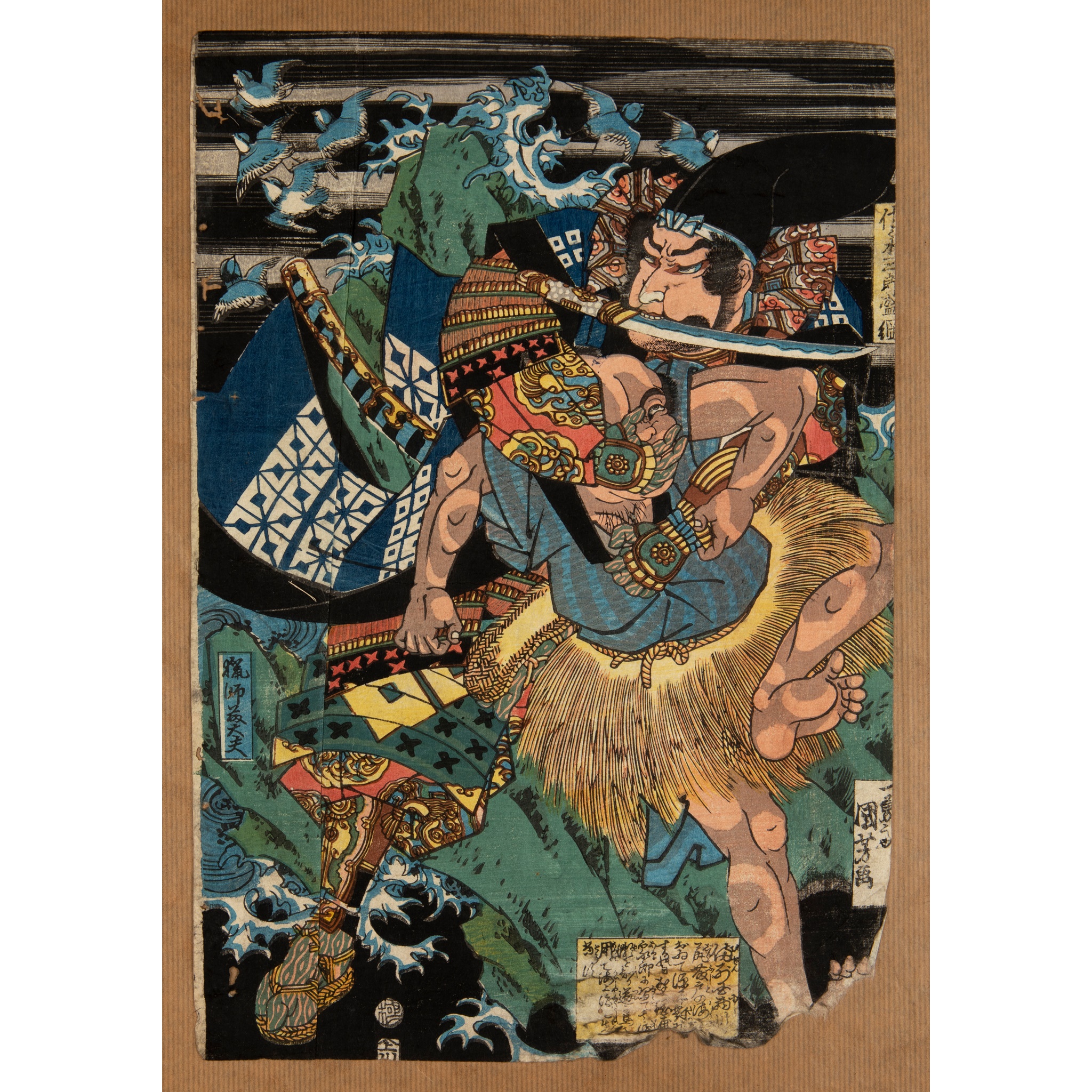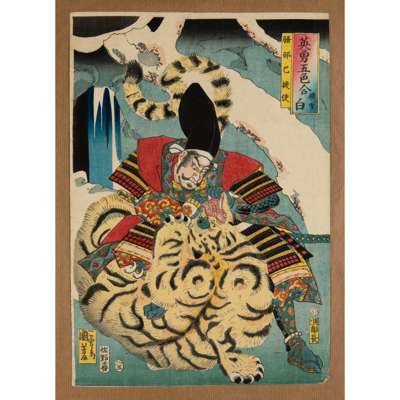 comprising six oban tate-e prints and one oban yoko-e print; including one depicting Sasaki Saburo Moritsuna strangling the fisherman Fujidayu, published by Kawaguchiya Uhei; one Kashiwade no Hanoshi wrestling a tiger in a cave, from the series Heroes Matched to Five Colours (Eiyu goshiki awase), published by Sanoya Kihei; one kabuki actor Iwai Hanshiro V in the role of Buddhist monk Seigen, in the play 'Sumidagawa hana no goshozome', published by Kawaguchiya Chozo; one Evening Glow at Awazu (Awazu yusho) from the series Military Brilliance of the Eight Views (Yobu hakkei), with scene Tomoe-gozen after the battle of Awazugahara, published by Enshuya Matabei; one of the triptych from the picture album Edo Fūzoku Azuma Nishiki-e, published by Tsujiya Yasubei etc.