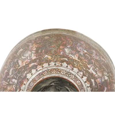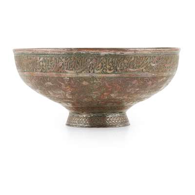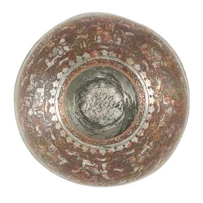 on a splayed foot, with slightly flaring sides and upright rim, the external rim engraved with inscriptions in nasta’liq comprising the call on God to bless Muhammad and the twelve imams, the body decorated with an intricately detailed hunting scene depicting horsemen holding various weapons including spears, swords, and bows and arrows, a variety of prey and hunting dogs, all on a reserve of scrolling clouds, the body engraved with ‘Ja’far’ (owner’s or maker’s name), the base later inscribed with ‘The owner, Hasan bin Muhammad’